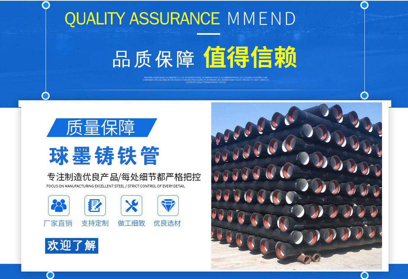 山西飛翔鑄業(yè)有限公司是一家以新興技術致力于研制開發(fā)、生產、銷售、施工安裝各種球墨管廠家,球墨鑄鐵管價格,國標球墨管,k9球墨鑄鐵管,國標球墨鑄鐵管,離心球墨鑄鐵管等系列鑄鐵產品。公司擁有完善的銷售、售后服務體系及一支由鑄造專家、工程師組成的精通產品設備和生產鑄造的技術力量隊伍。隨著企業(yè)的發(fā)展,我們積累了豐富的鑄造經驗與科技水平。使得產品具有高強度、高韌性、耐腐蝕性強等性能。同時,我們獲得質量管理體系認證、產品質量認證、職業(yè)健康體系認證、環(huán)境管理體系認證。產品暢銷各地并打入韓國、新加坡等東南亞市場。 在未來的發(fā)展中,公司奉行誠信共雙贏,合作創(chuàng)盛世的企業(yè)理念。讓我們一起共創(chuàng)美好未來!  公司產品采用良好的工藝流程,以確保產品質量的穩(wěn)定性:以良好的設備,確保質量的可靠性。廣泛應用于國內外城市的市政建設,通信,自來水,消防,園林,環(huán)保等行業(yè),產品大獲贊譽!  我們有多年的井蓋生產經驗,多名老技術工人有將近二十年的生產經驗,還聘請多名新技術研發(fā)人員,因為我們始終堅信質量才是未來生存的根本,只有把質量保證了,企業(yè)才會有更加美好的未來。公司堅持用心服務,誠信為本,與時俱進,科技為先的企業(yè)理念,堅持科技先導、竭誠為廣大用戶服務。歡迎各界朋友蒞臨我公司參觀,指導洽談業(yè)務,相信選擇我們就是選擇我們共贏的明天...